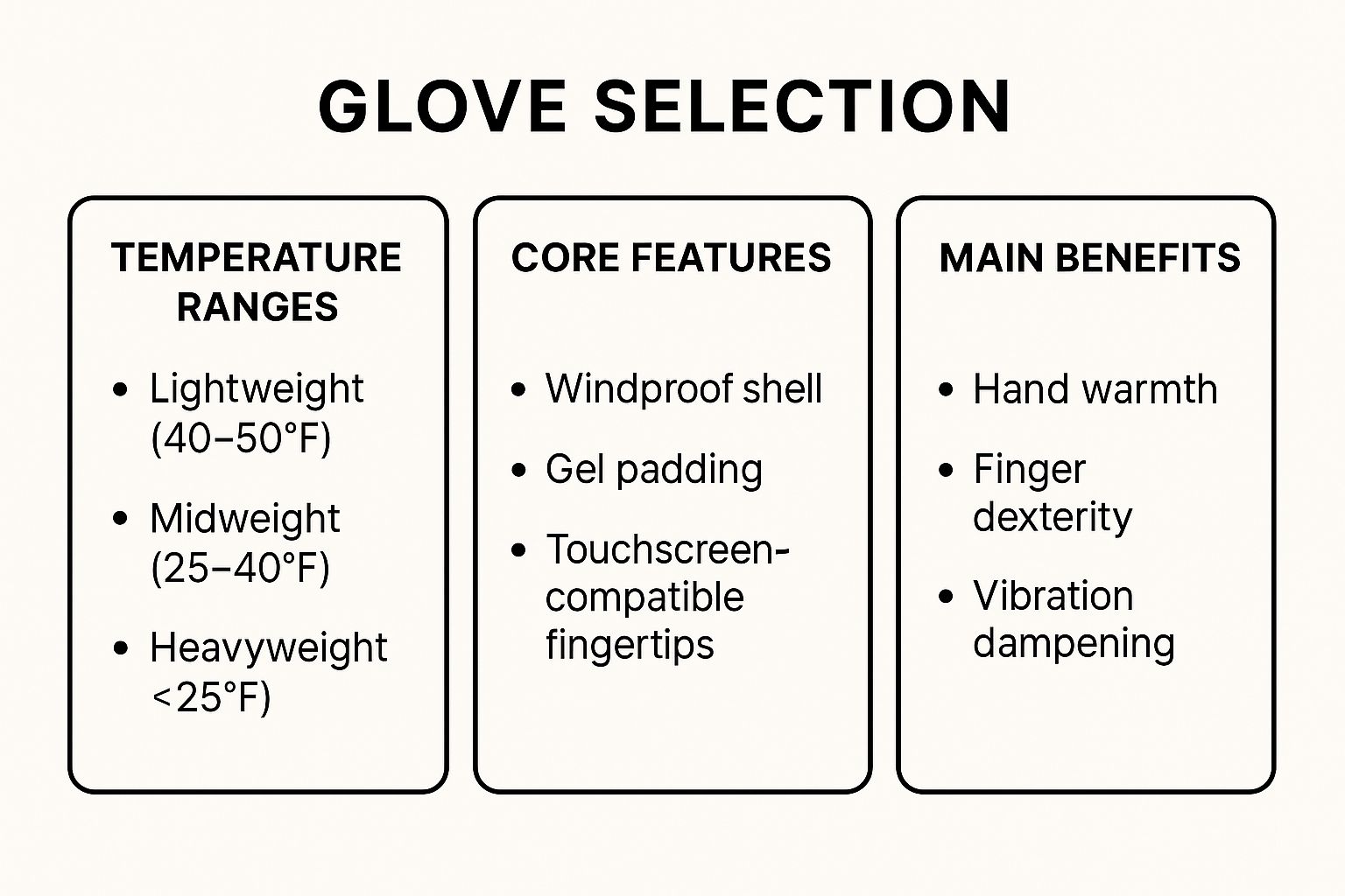 As the data shows, selecting the right glove involves matching its weight to the temperature while ensuring it has core cycling-specific features to maintain control and comfort. This combination prevents numb fingers, which can dangerously slow your reaction time on the brake levers.