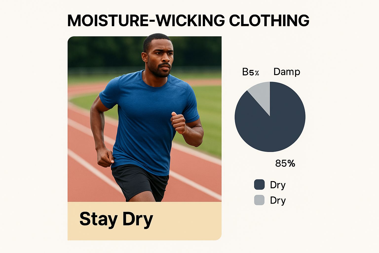 The infographic above shows a jogger comfortably exercising in moisture-wicking clothing, emphasizing the "Stay Dry" benefit. This visual highlights how the right fabric can significantly impact comfort and performance during activity.